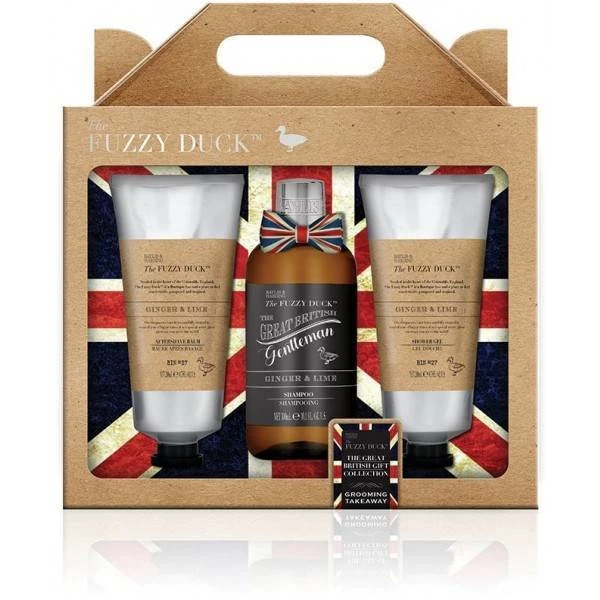 - Buff-coloured gift box with carry handle containing trio of grooming essentials