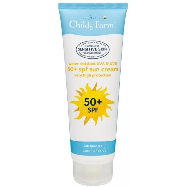 - Childs Farm new formulation SPF 50+ Sun Cream for very high protection, is water-resistant and protects young and sensitive skin from UVA and UVB rays, whilst keeping skin moisturised and hydrated.