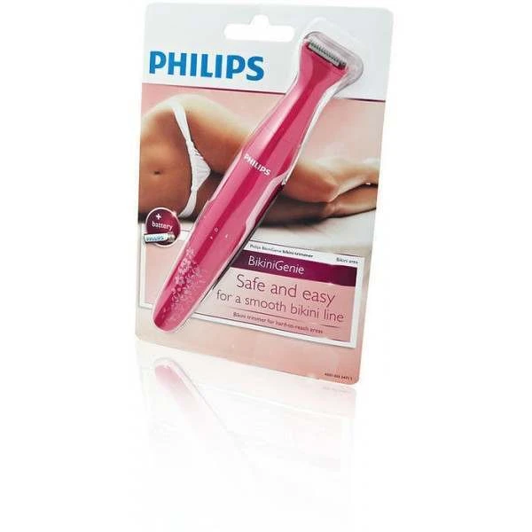 - Petite, fun design and playful colour – The Philips BikiniGenie is designed to enchant. Its petite, fun design and playful colour makes it perfect for use at home or at the beach. No fuss, no hassle, just flick the on/off switch at the side of the device to get started. Simply place the trimming head onto the hair you want to remove and glide it against the direction of your hair growth. For best results, keep skin taut while trimming.