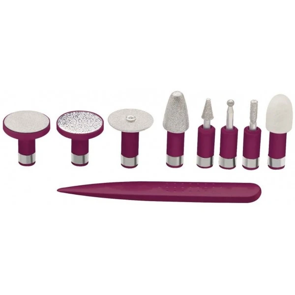 - Practical pouch with nine attachments: Sapphire Shaping Disc, Fine Sapphire Disc, Coarse Sapphire Disc, Sapphire Cone, Polishing Cone, Flame Stone, Rounded Stone, Cylindrical Stone and a hand held cuticle stick.