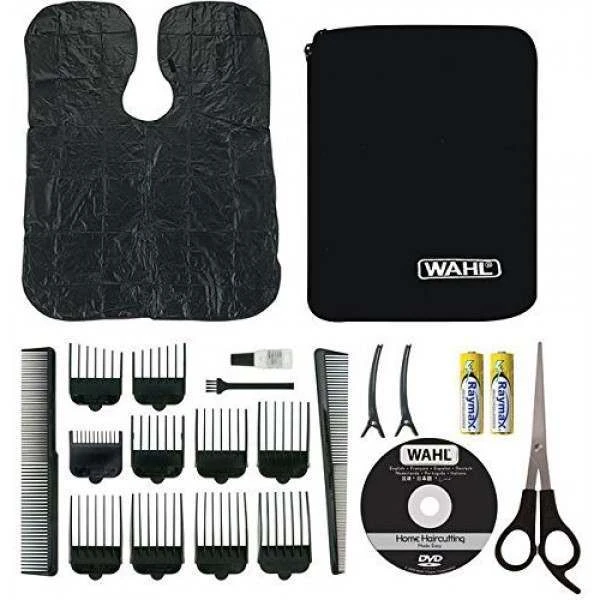 - Box ContainsClipper,Blade guard,Compact trimmer,Nasal trimmer,8 Attachment combs (#1-#8),Left and right ear combs,Ear and eyebrow trim combs,Barber comb,Medium Comb,Scissors,Water spray bottle,Barber Cape,Cleaning brush,Clipper Oil,Mirror,How to DVD,2 AA batteries,Soft carry case