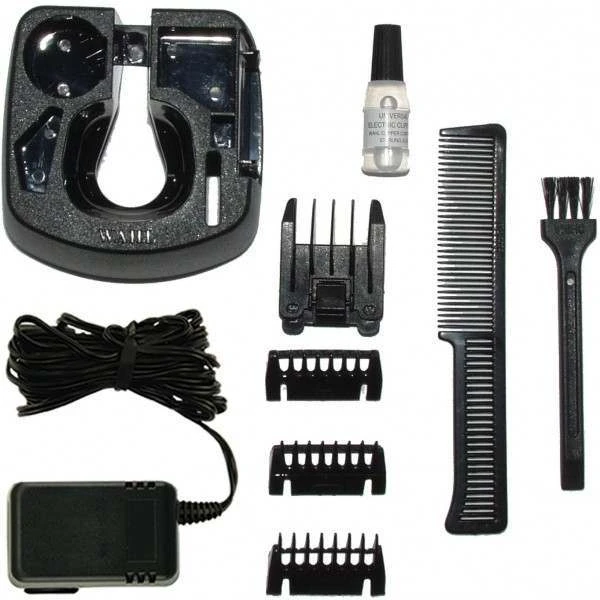 - Box contains: Rechargeable trimmer,3 x Close trim attachment combs,1 x 6 Position adjustable attachment comb,Storage/charge stand,Moustache comb,Blade oil,Cleaning brush,Instructions